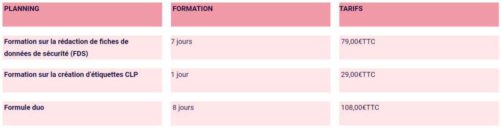 • Formation sur la rédaction de fiches de données de sécurité (FDS) + cours offert, ainsi que la Formule complète (rédaction de FDS + cours offert + création d’étiquettes CLP) : Ces formations suivent un planning précis et organisé. Vous devrez choisir et indiquer vos dates lors de votre inscription.